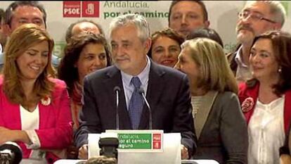 Poco después, el Gobierno socialista, visiblemente feliz, ha rodeado a su presidente, José Antonio Griñán, en la sede del socialismo andaluz. "El corazón de los socialistas y las socialistas está lleno de gratitud a todos los andaluces porque han vuelto a otorgar un gran respaldo al PSOE, en unas circunstancias económicas y políticas muy diferentes", ha destacado Griñán, que ha subrayado que ninguna fuerza tiene la mayoría, pero que una gran mayoría de andaluces no ha votado a la derecha. "Lo más importante es que Andalucía pueda contar con un Gobierno estable". También se ha comprometido a esforzarse para que la región salga de la crisis "preservando los derechos de los andaluces", ha recalcado.