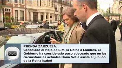 La reina Sofía no viajará el viernes a Londres, donde iba a asistir a los actos del Jubileo de diamantes de la reina Isabel II, que celebra sus 60 años en el trono. La Casa del Rey ha informado de que el desplazamiento ha sido suspendido porque el Gobierno lo ha considerado "poco adecuado en las actuales circunstancias".