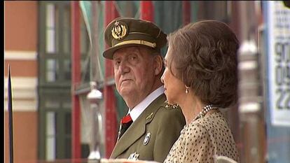 Bajó del coche oficial y subió por una rampa hasta la tribuna, apoyándose en una muleta. Luego, la apartó como un objeto inútil y adoptó la posición de firme. Desfilaron banderas coronelas portadas por militares con uniformes de la época de la Constitución de Cádiz, saltaron dos paracaidistas portando una bandera de España de 39 metros cuadrados, sonaron los acordes del homenaje a los caídos, sobrevoló la patrulla Águila dejando una estela rojigualda... Pasaron los 45 minutos que duró el acto castrense y el Rey seguía en pie, con uniforme de capitán general del Ejército de Tierra. A su lado, la Reina. Un paso atrás, los Príncipes de Asturias y las demás autoridades.