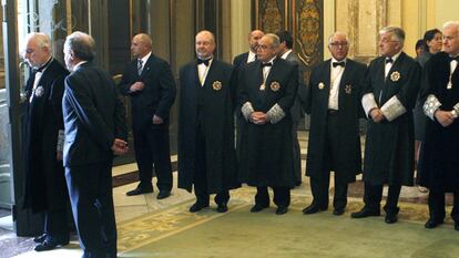 Tampoco se vio cómodo al Príncipe, investido con toga, Toisón de oro y el Gran Collar de la Justicia que utiliza el Rey cuando preside actos en el Supremo. Abrevió su intervención, de apenas un folio, recibió un libro conmemorativo y desapareció un cuarto de hora después de iniciado el cóctel. Dívar bajó a acompañarle y ya no regresó al salón de plenos. La vicepresidenta Soraya Sáenz de Santamaría; el ministro de Justicia, Alberto Ruiz-Gallardón; el presidente del Tribunal Constitucional, Pascual Sala, y muchos otros aprovecharon la coyuntura y desaparecieron también. Solo el fiscal del Estado, Eduardo Torres-Dulce, permaneció en el salón departiendo con presidentes de Sala del Supremo, magistrados, fiscales y vocales del Poder judicial.
