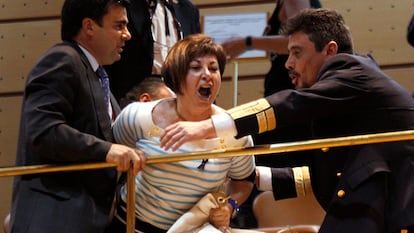 La mayoría ha salido en orden, aunque aún cantando. Una sin embargo se ha agarrado a la barandilla y ha comenzado a insultar a los senadores, por lo que ha tenido que ser desalojada a la fuerza. Mientras la votación de las enmiendas a los Presupuestos se reanudaba en el hemiciclo, las mujeres de los mineros han ido abandonando el Palacio del Senado y se han unido al resto de compañeras que las esperaban fuera.