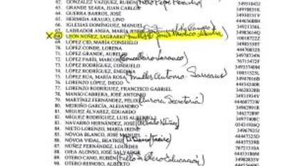 Hay 38 anotaciones en ese listado identificando familiarmente a los aspirantes con sus personas de confianza, pero solo los nombres de cuatro de los candidatos aparecen marcados con una cruz: los de los cuatro que finalmente aprobaron la oposición y obtuvieron los puestos de trabajo en la institución.