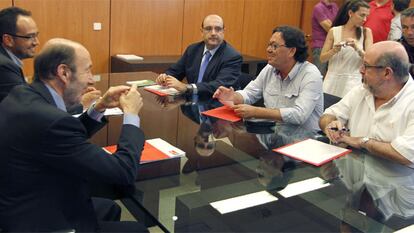Estas consideraciones las realizó tras reunirse con los líderes sindicales de Comisiones Obreras, UGT y la CSIF de la función pública. Estos también denuncian que no existe diálogo con la Administración y por tanto tienen que pedir el apoyo y el amparo de los partidos de la oposición para que lleven sus reivindicaciones al Parlamento. “Con ello pueden contar”, aseguró Rubalcaba.