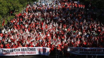 Miles de personas han tomado la plaza de Colón y las calles adyacentes de Madrid, en un ambiente festivo pero reivindicativo contra el Gobierno. En la plaza de Colón, han intervenido ya todos los líderes sindicales. Entre ellos, el secretario general de UGT, Cándido Méndez, que ha reclamado en nombre de los manifestantes un referéndum sobre las políticas del Gobierno y ha arremetido contra Luis de Guindos: “El ministro de Economía ha dimitido mentalmente y ha vuelto a recuperar la figura del delegado de Lehman Brothers en Madrid”. Además, ha asegurado que el Ejecutivo quiere pasar de un "Estado del bienestar al Estado de la beneficiencia". Antes del inicio de la marcha, los convocantes advertían de que el Gobierno tiene la llave para que haya o no huelga general: "Dependerá de cómo responda al clamor de hoy", ha dicho el líder de CC OO, Ignacio Fernández Toxo.