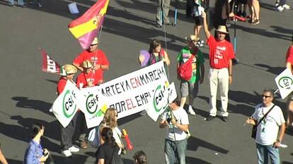 Junto a los sanitarios partieron los ‘naranjas’, cuya camiseta defiende los servicios sociales públicos, también recortados en los decretos anticrisis. Marcharon en un perfecto desorden, había camisetas aquí y allá en busca de una cabecera a la que sumarse. Difícil encontrar nada, porque se lucía más de un color en el mismo grupo familiar y, finalmente, salvo la marea verde, algo más compacta y visible, las blancas y las naranjas estaban mezcladas con las rojas de los sindicalistas. Las quejas, en todo caso, también eran compartidas. Laura no llevaba distintivo alguno, ni tampoco su hija, que iba por primera vez a una manifestación: solo tenía dos meses de vida y su madre le daba el biberón mientras marchaba a paso tranquilo. “Cuando estaba en la barriga ya ha ido a alguna más: la del 1 de mayo, la huelga general…”, recordaba.