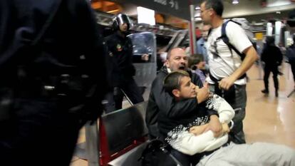 En otra de las capturas, de 38 segundos, alguien graba uno de los andenes de cercanías desde la vía opuesta. Se oyen detonaciones y se ven antidisturbios persiguiendo a gente ayudados por los vigilantes de seguridad. “¡Estáis locos! ¡Estáis locos! ¡Sois unos bárbaros!”, les gritan a los agentes.
