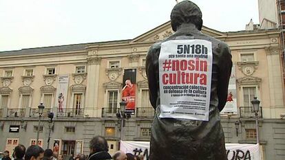 La Unión de Actores, acompañada por diversas personalidades del mundo de la cultura, se ha concentrado esta tarde en Madrid, en la plaza de Santa Ana, para mostrar su rechazo a la subida del IVA del 8% al 21%. Lo han hecho con sogas en las manos y en el cuello, símbolo, dicen, de la situación actual de la Cultura en España. Entre los asistentes, Carlos Bardem, Juan Diego Botto, Almudena Grandes y Natalia Millán.