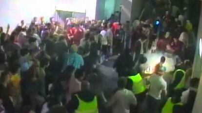 Las imágenes muestran cómo cuando se produce el incidente más grave de la noche no hay vigilantes de seguridad controlando que en ese pasillo de entrada a la pista central no se produzcan altercados. Es solo unos minutos más tarde de las 3.31 cuando ya empiezan a llegar vigilantes de Kontrol 34 que, ayudados por muchos jóvenes, intentan rescatar a los jóvenes atrapados dentro del vomitorio.