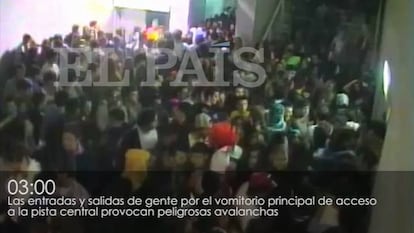 Las imágenes grabadas por decenas de cámaras de seguridad en el recinto municipal del pabellón Madrid Arena en la madrugada del 1 de noviembre pasado demuestran el deficiente control en los accesos al recinto y el exceso de aforo en la pista central de la planta baja, en uno de cuyos vomitorios se produjo la avalancha humana que provocó la muerte de cuatro chicas, aplastadas por la multitud, y dejó a otra joven muy grave en el hospital.