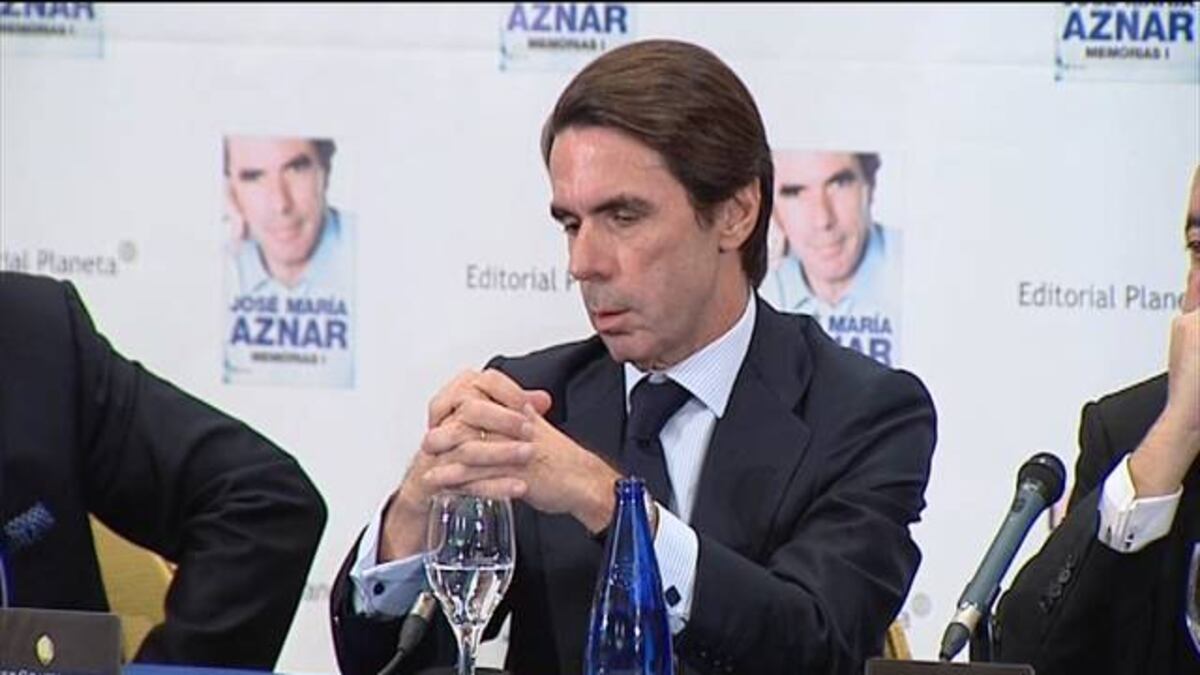 El expresidente presenta su libro de memorias junto a Rajoy y Rato Rato rehúsa contestar si, como dice Aznar, rechazó dos veces ser su sucesor "Esta no es la mayor crisis nacionalista que hemos tenido. Ya tuvimos una en 1934", afirma "Los nacionalismos son malos gobernantes", dice