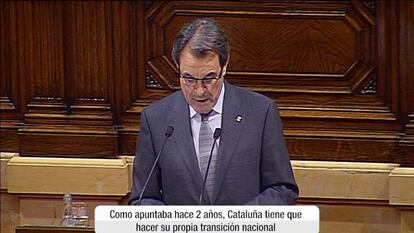“Si vamos a Madrid solo con Esquerra Republicana, nadie nos abrirá ni una sola puerta”. Así se expresaba la semana pasada un dirigente de Convergència i Unió, preocupado por el rumbo que tomaba la negociación con los independentistas para garantizar la investidura de Artur Mas. Este jueves, el presidente de la Generalitat en funciones asumió esta tesis, forzado por las presiones de los empresarios y de sus socios de Unió. En su discurso de investidura en el Parlamento catalán, Mas se empleó a fondo para dejar claro que su pacto con Esquerra no está cerrado a otras incorporaciones. Sin citarlo directamente, se refería al PSC. Para visualizarlo, defendió la consulta de autodeterminación de Cataluña, pero dejó claro que quiere encontrar “los marcos legales” que la hagan posible, como pide el PSC, y evitó citar el plazo de 2014 que pactaron CiU y ERC y que firmaron el día anterior.