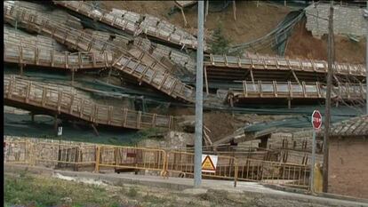 Una pasarela peatonal, construida hace apenas un año, se ha derrumbado en la localidad zamorana de Benavente, sin provocar víctimas pero sí un gran malestar y revuelo en la ciudad. La pasarela de madera, levantada en un lugar emblemático sobre una ladera, ha caído como un castillo de naipes en sus casi 1.500 metros de longitud. Los continuos movimientos de los taludes en el lugar en el que se levantó la pasarela (elevada sobre vigas de madera clavadas sobre el terreno) obligaron días atrás a cortar el acceso. La Junta de Castilla y León y el Ayuntamiento de Benavente promovieron las construcción de las rampas de madera en vísperas electorales con una inversión de casi un millón de euros.