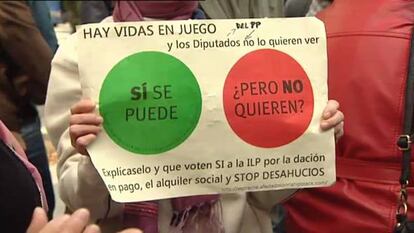 La PAH no ve rastro en la futura ley de las peticiones “de mínimos” de la Iniciativa Legislativa Popular (ILP) que presentaron avalada por casi 1,5 millones de firmas para reclamar la dación en pago retroactiva, la paralización de los desahucios y la generalización de los alquileres sociales y que el mismo jueves intentaron retirar del Congreso. “En cualquier momento puede haber cambios en la normativa, se pueden incluir en el Senado”, dijo el abogado Mayoral, que cree que los diputados del PP “tomaron la decisión de tirar a la basura la propuesta de la sociedad civil” con la votación. Los integrantes de la PAH discutirán ahora nuevas medidas de movilización “en las calles, en los juzgados y en cualquier parte”. Más allá de la polémica protesta, los antidesahucio se aferran a la reciente sentencia Tribunal de Justicia de la Unión Europea, que permite a los juzgados españoles paralizar cautelarmente desahucios mientras estudia si los contratos hipotecarios incluyen cláusulas abusivas. Afectados del colectivo acudieron de forma masiva a los tribunales tras el fallo de Luxemburgo y anuncian que seguirán haciéndolo. También mantendrán las movilizaciones para frenar desahucios in situ y las negociaciones con los bancos para más daciones en pago y alquileres sociales.