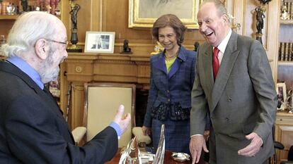 Animado, más delgado y sin muletas -aunque las utiliza habitualmente como apoyo para moverse por La Zarzuela- el Rey ha recibido al poeta y a su esposa, Josefa Ramis, en su despacho para felicitarle personalmente por haber ganado el máximo galardón de las letras españolas, que se entrega mañana. "Por motivos de espacio", según la Casa del Rey, solo las cámaras de TVE y la Agencia Efe han capturado la reaparición pública de don Juan Carlos siete semanas después de ser intervenido de una doble hernia discal. Los Reyes no asistieron después al almuerzo en el Palacio Real que ofrecieron los Príncipes de Asturias a un centenar de personalidades del mundo de las letras, ni presidirán mañana la ceremonia de entrega del premio, como sí harán don Felipe y doña Letizia. Mañana el Monarca recibirá, también en su despacho, al primer ministro eslovaco, Robert Fico.
