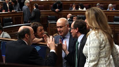 Los tres partidos estaban convocados ayer para rubricar el texto que debía presentarse antes de las ocho de la tarde de hoy. Sin embargo, su sensibilidad se irritó cuando el miércoles por la noche comprobaron que había ya un texto que Gobierno y PSOE daban por cerrado. Ayer por la mañana, Josep Antoni Duran Lleida anunció que CiU no acudiría y no sirvió de nada que Rubalcaba intentara convencerle en el hemiciclo. Aitor Esteban (PNV) le siguió y PSOE y PP acordaron suspender la cita. Rosa Díez (UPyD) quedó colgada entre esos dos fuegos cuando iba a acudir y terminó por sumarse a los otros dos portavoces para convertir su posición en un canto a los desastres del bipartidismo.