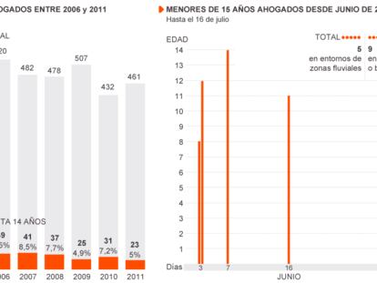 En la misma franja de edad a la que pertenecían estas últimas víctimas, es decir hasta los 14 años, en 2010 y 2011 fallecieron ahogadas 31 y 23 personas respectivamente, según el Instituto Nacional de Estadística (INE). Al cobrarse alrededor de 450 vidas al año entre personas de todas las edades (461 en 2011 y 432 en 2010), el ahogamiento es, en España, la segunda causa de mortalidad en accidentes después de los siniestros de tráfico, afirma el director de la escuela de la Federación Española de Salvamento y Socorrismo (RFESS), Alberto García.