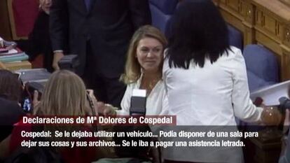 Nadie esperaba, en realidad, que la presidenta de Castilla-La Mancha admitiera haber tenido conocimiento —y mucho menos participación— en las graves irregularidades financieras que se derivan de la contabilidad manuscrita de Bárcenas. En ese aspecto, Cospedal se ciñó al guion previsto: “Nunca”. “Jamás”. “En absoluto”. “De ninguna manera”. “Es falso”... Hasta 46 veces rechazó haber cobrado sobresueldos en dinero negro o pedido sobornos a empresarios a cambio de adjudicaciones públicas. Pese a que varios cargos antiguos y actuales del PP, como Eugenio Nasarre, Jaime Ignacio del Burgo o el presidente del Senado, Pío García-Escudero, han admitido los apuntes que les afectan, Cospedal se desvinculó radicalmente de los asientos contables que llevan su nombre, como ya había hecho públicamente. En ese aspecto, ninguna novedad.