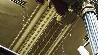 Unos minutos intensos de lluvia sobre Madrid han ocasionado más problemas de los que nadie en el Congreso de los Diputados pudo imaginar. El Pleno de la Cámara no pudo empezar a las nueve de la mañana porque una cascada de agua penetraba a esa hora por la techumbre de la tribuna de prensa del Congreso y de ahí las aguas seguían su camino natural hacia abajo, directamente a los escaños de Izquierda Plural y algunos del PSOE. Dos horas de aplazamiento se necesitaron para evitar que el agua siguiera cayendo. Todos pensaron de inmediato en las obras que se desarrollan en el Congreso desde el pasado diciembre y que finalizarán el próximo mes de noviembre.
