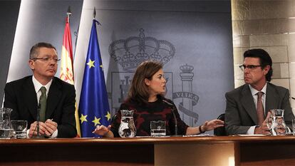 Santamaría, entre los ministros Gallardón y Soria, en el Consejo de Ministros de ayer.Foto: atlas | Vídeo: ULY MARTÍN / ATLAS