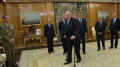 El Rey dejó las muletas a su ayudante y esperó de pie a los invitados, que venían acompañados de los presidentes del Congreso, Jesús Posada, y del Senado, Pío García-Escudero, y el embajador marroquí en España, Ahmed Ould Souilem. Con este último, don Juan Carlos comentó, en francés, que el monarca alauí, Mohamed VI, le había llamado precisamente esa mañana para interesarse por su salud y desearle una pronta recuperación.