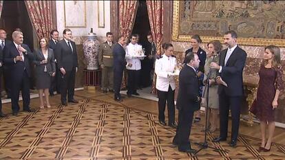 Al Príncipe le costó hacerse oír, en medio del barullo, porque los cerca de mil asistentes a la recepción en el Palacio Real por el 12 de octubre charlaban despreocupados. No esperaban lo que iba a ocurrir porque nunca había ocurrido antes. Tras pedir silencio hasta en cinco ocasiones, don Felipe leyó un mensaje del Rey, ausente por primera vez en la celebración de la Fiesta Nacional, convaleciente de la operación de cadera a la que se sometió el pasado 24 de septiembre. “Hoy es un día para celebrar lo que nos une. Para recordar nuestra historia milenaria y valorar lo mucho que hemos conseguido juntos”, dijo el Príncipe, hablando en nombre de su padre. “Pero sobre todo es un día para reafirmar nuestro compromiso con un futuro compartido de concordia y de progreso para todos los españoles. Si lo que hoy nos une es mucho, es mucho más lo que cada día seguirá estrechando nuestros vínculos y los de toda España con la comunidad internacional. España, con la Corona a su servicio, continuará trabajando siempre para garantizar ese progreso, ese porvenir, superando cualquier dificultad”.