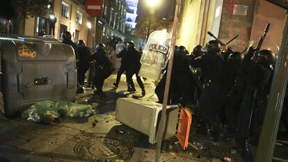 Cuando han llegado los refuerzos de la UIP, los manifestantes se han atrincherado detrás de varios contenedores de vidrio, los han volcado y han utilizado su contenido como arma arrojadiza. Durante unos minutos, la policía ha recibido una lluvia de botellas hasta que los agentes han cargado con las porras, dispersando a los dos centenares de personas que observaban la escena y gritaban consignas de protesta.
