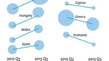 El gráfico superior muestra la evolución de la presión migratoria que soportan los diez países de la Unión Europea (UE) que más extranjeros irregulares reciben, según los datos recogidos por Frontex. El tamaño de los círculos —sobre cada nación, los de la izquierda se refieren al tercer trimestre de 2012 y los de la derecha al mismo periodo de 2013— representa el número de inmigrantes que acceden a cada país. En esta ilustración se aprecia como el total de personas que entró en España de forma irregular es inferior al de otros países, como Grecia e Italia.