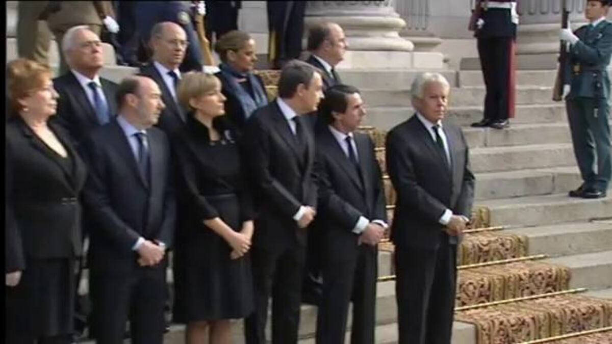 Las autoridades reciben el féretro con los restos de Adolfo Suárez en las escalinatas del Congreso.