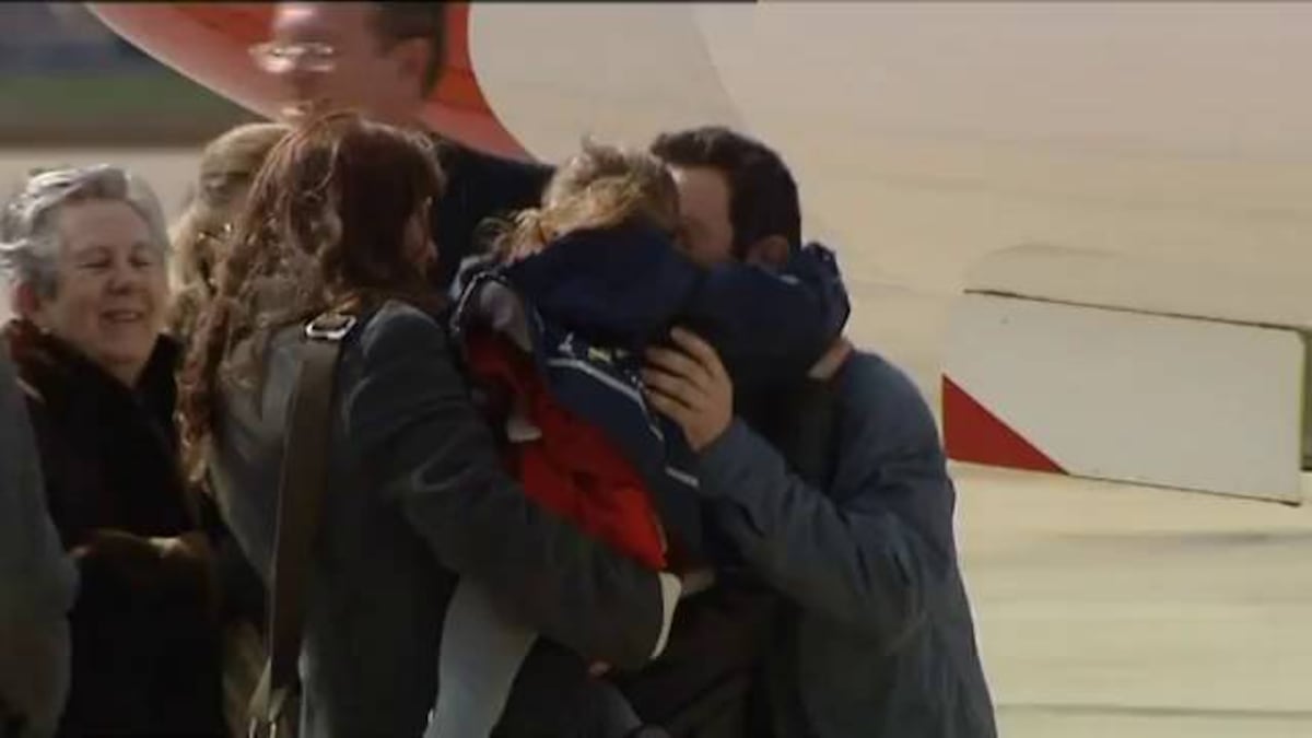 Horas después, ambos llegaban en un avión militar a la base aérea de Torrejón de Ardoz, en Madrid. En la pista les esperaban sus familias, la vicepresidenta del Gobierno, Soraya Sáenz de Santamaría, y el director general del CNI, Félix Sanz Roldán. "Visiblemente más delgados pero con buen aspecto ambos se han reunido con los suyos", informa El Mundo, que destaca "la sonrisa permanente en el rostro" de la también periodista Mónica García Prieto, pareja de Espinosa, que acudió con los dos hijos de ambos. También estaban los padres de los dos periodistas liberados junto a otros parientes. "Estamos perfectamente", ha asegurado Espinosa, tras apuntar que no podía dar detalles sobre el secuestro.