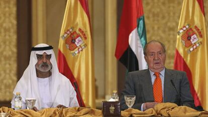 Don Juan Carlos agradeció a Emiratos “la confianza” que han depositado en España, incluso cuando pocos lo hacían — “mirando más allá del sentido de la inversión”, afirmó—. Y pidió que sigan haciéndolo. “Sabemos de sus ambiciosos planes”, dijo el Rey ante el ministro de Estado de Emiratos Árabes, el sultán Ahmed Al Jaber, refiriéndose al plan Abu Dhabi 2030 o a la exposición internacional de Dubai 2020, en los que invertirán más de 20.000 millones de dólares.