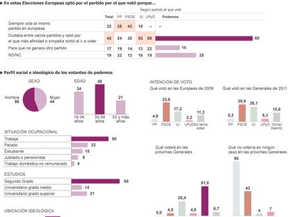 La sorpresa de Podemos, que logró 1,2 millones de votos en las elecciones del 25-M y cinco escaños en el Parlamento Europeo, descolocó a las direcciones de los dos grandes partidos. El éxito de la formación encabezada por Pablo Iglesias superó las previsiones de PP, PSOE e Izquierda Unida y acabó de romper la baraja de los equilibrios tradicionales al irrumpir como tercera fuerza, por ejemplo, en la Comunidad de Madrid. Un sondeo de Metroscopia para EL PAÍS sobre el perfil de los votantes de Podemos también arroja otras sorpresas que chocan con la creencia de que se trata de un voto mayoritariamente joven —el 66% tiene más de 35 años—, con el discurso público de los dirigentes del partido y con la imagen antisistema que, sobre todo, los dirigentes del PP asocian a esta opción.