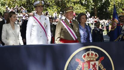 Aunque la celebración del Día de las Fuerzas Armadas ha sido este año más vistosa que en ocasiones anteriores —y también un poco más cara, 139.000 euros, frente a 115.000 de 2013—, la atención de los 263 periodistas acreditados estaba más pendiente de don Juan Carlos, que encara sus últimos diez días de reinado, y de don Felipe, a punto de sucederle.