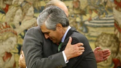 El toisón es la máxima condecoración que concede la Corona y se devuelve tras el fallecimiento de su titular. Suárez murió el 23 de marzo de este año tras una larga enfermedad neurodegenerativa. La entrega hoy en La Zarzuela ha sido emotiva para su hijo y para el Rey. Suárez Illana acaba de operarse de cáncer, la maldición de la familia. "Estoy muy bien, algo cortadito", le ha contestado al Monarca, mostrándole las cicatrices de la operación, cuando le ha preguntado cómo se encontraba. "El caminito no es fácil ni corto, pero lo andaremos con mucho ánimo y buen humor". Don Juan Carlos le ha abrazado, muy cariñoso, al hijo del primer presidente de su reinado.