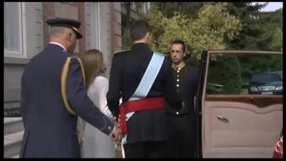 Hacen este recorrido en dos vehículos, el primero de ellos un Rolls Royce, perteneciente a Patrimonio Nacional, y que va ocupado por los Reyes, y un segundo en el que van sus hijas
