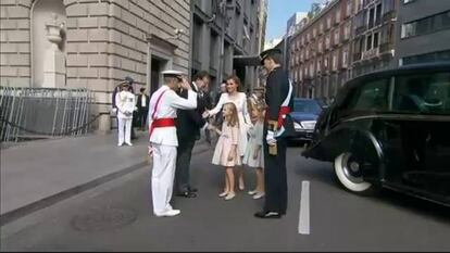 Don Felipe, doña Letizia y sus hijas, la Princesa de Asturias y la infanta Sofía, entraban al Palacio del Congreso y se dirigían al Vestíbulo de Isabel II para saludar a las autoridades