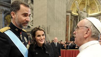 Don Felipe y doña Letizia asistieron a la ceremonia de inicio de pontificado del papa Francisco, el 19 de marzo del año pasado. El Papa le preguntó al entonces Príncipe cómo se encontraba el rey Juan Carlos, convaleciente de una operación de hernia discal, y don Felipe le contestó: “Recuperándose poco a poco”. Hoy, como en aquella ocasión, pero ya como Rey, está previsto que don Felipe anime al Papa a viajar pronto a España.
