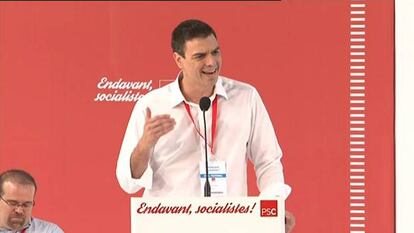 En el mismo sentido, Pedro Sánchez se ha comprometido a impulsar una reforma federal de la Constitución para evitar el choque de trenes "al que nos llevan la derecha española y catalana", así como para "dar sentido a la España federal que late en nuestra alma". "Se acabó el tiempo de los reproches", ha dicho el nuevo líder del PSOE. Por eso ha reclamado al presidente del Gobierno y al de la Generalitat "que se pongan a trabajar y a negociar la reforma constitucional que necesita España".