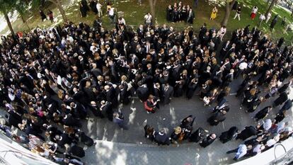 Con togas negras, como cuando van a los tribunales, pero esta vez han salido a las calles. Más de 700 abogados de oficio de los 83 colegios de España han protestado este jueves en Madrid contra la "precarización" de la justicia gratuita. El gremio pide al ministro de Justicia, Alberto Ruiz-Gallardón, que retire del Congreso el proyecto de Ley de Asistencia Jurídica Gratuita, que reemplazará a la legislación vigente desde 1996, porque "perjudica" tanto a los ciudadanos como a los letrados. Son 42.500 los adscritos en todo el país y, según ellos, cobran —de media— dos euros por hora.