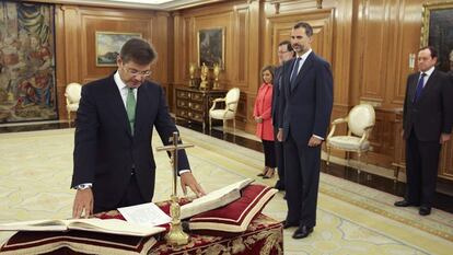 El nuevo ministro juró su cargo en la Zarzuela y es el primer miembro del Gobierno que lo hace en presencia del Rey Felipe VI. Es el segundo que se incorpora en la legislatura como miembro del Gabinete de Rajoy, después de que Isabel García Tejerina sustituyera en Agricultura a Miguel Arias Cañete, cuando este fue designado cabeza de lista del PP en las europeas del pasado mes de mayo. Luego, al acto de toma de posesión en el Ministerio de Justicia asistieron el propio Gallardón, la vicepresidenta Soraya Sáenz de Santamaría y los ministros de Asuntos Exteriores, José Manuel García Margallo; Defensa, Pedro Morenés; Hacienda, Cristóbal Montoro, y Fomento, Ana Pastor, así como del presidente del Tribunal Supremo y Consejo General del Poder Judicial (CGPJ), Carlos Lesmes, y el fiscal general del Estado, Eduardo Torres-Dulce. También acudió la presidenta de Castilla-La Mancha y número dos del PP, Dolores de Cospedal, entre otros.