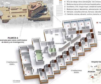 En la tarde del jueves, el Carlos III ha distribuido a los pacientes en dos plantas. En la sexta está ingresada la auxiliar y los dos profesionales de enfermería —un hombre y una mujer— que forman parte del equipo que trató a los dos misioneros repatriados desde África Occidental. En la quinta, que fue desalojada de pacientes el miércoles, están aislados los cuatro médicos que tuvieron contacto con ella. También el marido de la paciente. Ninguna de estas cinco personas ha presentado síntomas. En el caso de los enfermeros, ayer a última hora se esperaban los resultados del primer test de ébola, que posteriormente, dé el resultado que dé, deberá ser confirmado con un segundo análisis.