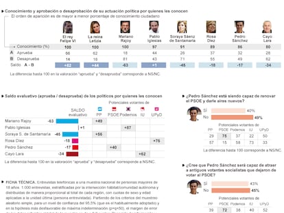 Sánchez es el más valorado tras Pablo Iglesias, aunque no apruebe. Los datos sobre la evaluación de su gestión entre los votantes del PSOE, los que en definitiva deben juzgarlo, son buenos. El 75% le ve capaz de renovar el partido y darle aires nuevos y el 72% cree que podrá atraer antiguos votantes socialistas.