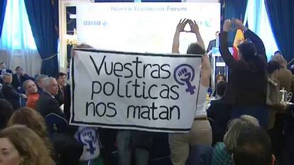 Alonso estaba presentando, en un desayuno informativo de Nueva Economía Fórum, a su sucesor al frente del Grupo Popular en el Congreso, Rafael Hernando, cuando las jóvenes se han levantado y han desplegado una pancarta en la que se podía leer: "Vuestras políticas nos matan".