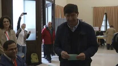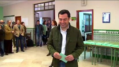 El líder del PP en Andalucía, Juan Manuel Moreno Bonilla, vota en Málaga. Se presenta por primera vez a las elecciones, al igual que el resto de candidatos de los principales partidos. "Quiero enviar un mensaje de agradecimiento a quienes hacen posible que esta jornada sean un rotundo éxito e invito a los andaluces a que acudan masivamente" a las urnas. "Le deseo suerte a todas las fuerzas políticas y a la mía más que ninguna", ha bromeado. Son unas elecciones muy importantes para mí, porque son las primeras", ha comentado Moreno, "y las asumo con mucha ilusión, fuerza y ganas de tener una oportunidad para transformar Andalucía y por eso tengo esa actitud positiva y relajada".