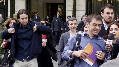 Iglesias ha acudido acompañado por su número tres, Juan Carlos Monedero. Ha iniciado su presentación recordando la broma que ya utilizó en junio del pasado año cuando ofreció su primer desayuno informativo en el Hotel Ritz. "Dije que pocos se podían imaginar que una persona como yo pudiera dar una conferencia en el Ritz. Dije que me imaginarían entrando en este hotel con intención de nacionalizarlo o expropiando los abrigos de pieles a las señoras, y nada más lejos, queremos siempre dialogar", ha defendido.