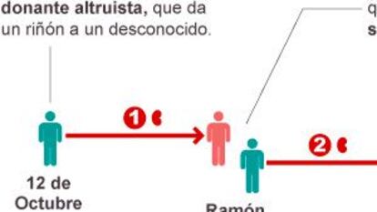 El buen samaritano inicia lo que se conoce como cadena de trasplante cruzado: su riñón se le trasplanta a un receptor desconocido; un familiar (generalmente la pareja) de este receptor dona su riñón a otro enfermo, cuyo pariente hace lo mismo con otra persona con la que tiene compatibilidad, etcétera. La mayor cadena realizada hasta ahora en España permitió trasplantar seis riñones en abril de 2014. El primero procedió de un donante altruista. Cinco parejas de donante y receptor con órganos incompatibles entre ellos y un receptor en lista de espera de un riñón de cadáver completaron los eslabones. En Estados Unidos se han practicado cadenas de hasta 30 injertos. Allí, y en otros países, las cadenas de trasplante cruzado se realizan desde hace años, pero en España se trata de una práctica relativamente reciente. La primera la inició un sacerdote catalán en 2011. "Dando, doy más de lo que recibo", dijo el buen samaritano en una grabación difundida por el Ministerio de Sanidad. "Ahora me siento más ligero", añadió. Actualmente se encuentra en buen estado de salud, pero no quiere hablar con los medios de comunicación. Su riñón fue para Josep Antoni Sánchez, de 62 años, de Barcelona. "Para mí ya forma parte de la familia, es mi hermano. Me ha devuelto la vida. Me gustaría conocerle, pero la ley no lo permite, ya me lo han dicho los médicos", relató a este diario.