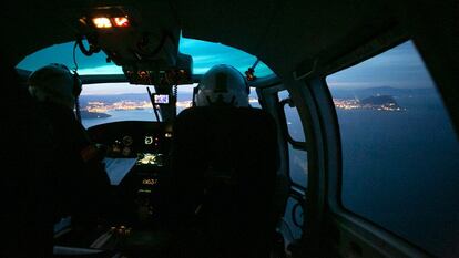 Son las ocho de la tarde y el helicóptero de Vigilancia Aduanera, que hace dos fines de semana cazó dos barcas con unos 2.000 kilos de hachís, despega con EL PAÍS a bordo. Vuelan dos pilotos y un observador que controla la cámara térmica. Vigilan todo el Estrecho. Cuando ven una barca, pueden acosarla para que dé vuelta atrás, tire la carga o fuerce demasiado la máquina y rompa algún engranaje en la persecución. Hubo un tiempo en que incluso se disparaba al motor desde el aire para inmovilizar la lancha. Para evitarlo, los copilotos empezaron a abrazarse a la maquinaria. A Antonio, el lanchero retirado, le sucedió alguna vez, pero esta técnica ya no se usa. “Demasiado peligroso. Un muerto pesa mucho en las espaldas”, dice uno de los observadores.