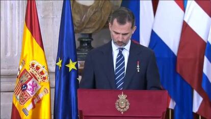 Hace cinco años Felipe VI acompañó como príncipe al rey Juan Carlos en una celebración similar. En su alocución, ha recordado ese momento y se ha alegrado "especialmente" de que le acompañara en este acto, el primero que protagonizan juntos tras la proclamación y después del almuerzo con altos representantes del Estado por el primer aniversario. El Rey ha agradecido a su padre las "profundas convicciones europeas" y el trabajo que llevó a cabo durante muchos años para situar a España "en su singladura europea".