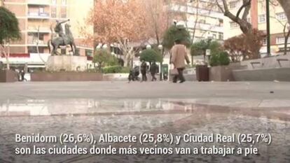 Benidorm encabeza la lista de ciudades con habitantes que prefieren ir a trabajar a pie. El 26,6% de la población del municipio alicantino se decanta por este medio. El segundo y tercer lugar lo ocupan ciudades de Castilla–La Mancha. El 25,8% de los habitantes de Albacete se inclina por ir andando; en Ciudad Real, el 25,7%. Dos municipios madrileños ocupan los últimos puestos: Las Rozas (5,7%) y Pozuelo de Alarcón (5,8%).