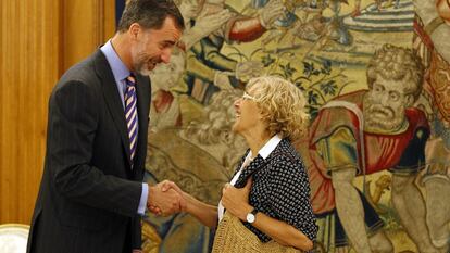 El Rey se ha reunido este viernes en el Palacio de la Zarzuela con la presidenta de la Comunidad de Madrid, Cristina Cifuentes, y la alcaldesa de la capital de España, Manuela Carmena, a las que ha concedido audiencia por separado. Felipe VI y Cifuentes han hablado sobre el momento político que vive España y han coincidido en que se “requiere mucha cercanía” con la sociedad.