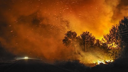 Las llamas se quedaron a apenas 200 metros de la aldea de Niñodaguia, en el Ayuntamiento de Baltar, después de una noche en la que los vecinos lucharon contra su avance subiendo cisternas a sus tractores para lanzar agua. "Esto es un completo infierno y aquí no hay medios apagando el fuego, estamos solos cuatro pobres de pueblo intentando defender nuestras casas con unas xestas [retamas en castellano]", relataba por teléfono, desesperada, Mari, uno de los 60 vecinos de este núcleo, mientras intentaba el domingo por la noche frenar el fuego que amenazaba las viviendas. El incendio bajó a velocidad de vértigo el domingo por la tarde desde la Serra do Larouco, pero los equipos contraincendios, desbordados, apenas pudieron parar en Niñodaguia, lamenta Mari.